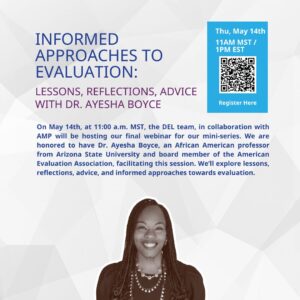 On March 13th, at 10:00 a.m. MST, the DEL team, in collaboration with AMP and EC3 will be hosting our second webinar for our mini-series. We are honored to have Dr. Melissa Tremblay, an Indigenous professor from the University of Alberta, and supervisor of the DEL Team, facilitating this session. We’ll explore lessons, reflections, advice, and informed approaches towards evaluation.