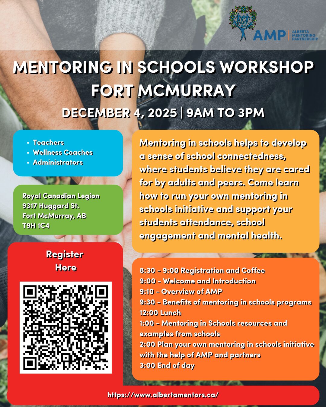 Alberta Mentoring Partnership (AMP) is bringing a Mentoring in Schools Workshop to school staff in Fort McMurray and surrounding communities.